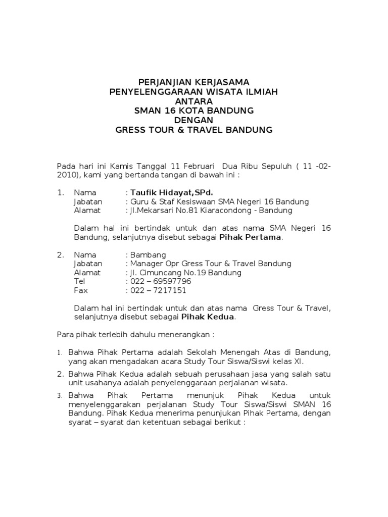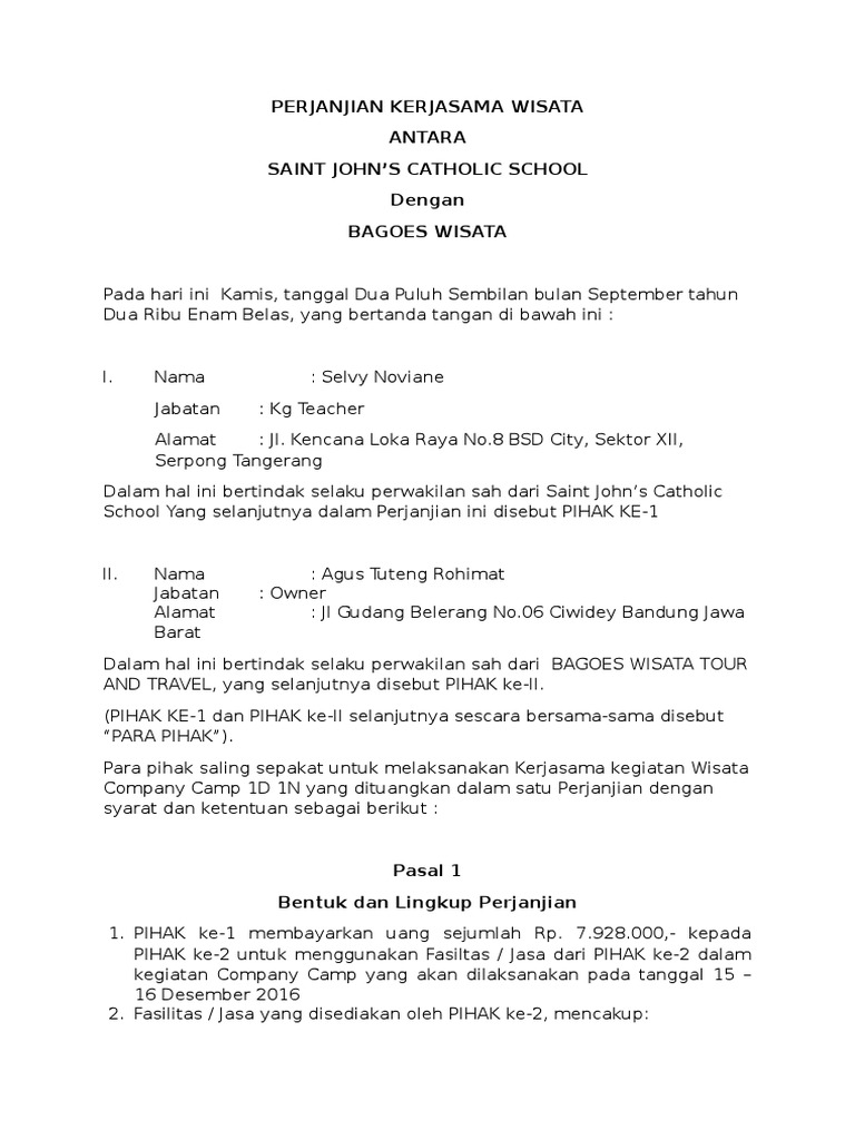 Contoh Surat Perjanjian Kerjasama Tour Dan Travel Muda Mudi Condrowangsan
